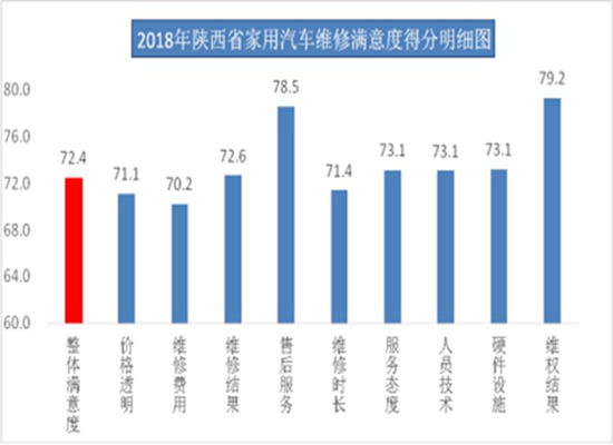1、在此次调查中,家用汽车维修消费者满意度得分为72.4分。其中,售后服务与维权结果满意度得分较高,分别为78.5分和79.2分;相对来说,维修费用、价格透明和维修时长指标的满意度得分较低,分别为70.2分、71.1分和71.4分。(图1)