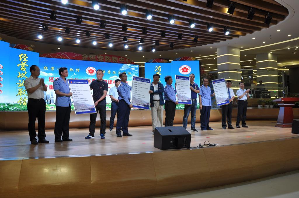 上午10时,来自延安市县两级工商和市场监管部门、放心消费创建工作联席会议成员单位、汽车销售行业等重点商品商场、市场的企业管理人员260多人,齐聚宝塔区(河庄坪)圣地河谷金延安,按照“工商队伍”、“创建成员单位”、“商场市场”和“汽车销售”四个方阵,统一佩戴放心消费笑脸微章,通过举行隆重的市场“场长制”启动仪式,推进放心消费创建工作。按照议程,大会首先由延安市放心消费创建办公室主任、市工商局局长屈志芳介绍放心消费创建工作情况,杨光远副市长代表延安市政府向创建活动中的“延安新丰泰博奥汽车有限责任公司”、“延安居然之家建材家居有限公司”、“延安华尔商业管理有限公司”、“甘泉八千里食品有限责任公司”、“陕西延元商业运营管理有限公司百货大楼分公司”等五家“放心消费单位”进行了集中授牌,省工商局余智德副局长和市政府杨光远副市长共同见证了“华润万家生活超市”场长屈志芳、“居然之家建材商城”场长马立新、“新圣明宫建材市场”场长郭宁安、“白坪农贸市场”场长高景扬以及“圣地河谷金延安”五个市场“场长制”公示牌授牌。金延安购物中心负责人张美玲女士作为企业代表进行了发言,其市场“场长制”联络员、辖区工商所杨延平所长进行了表态,最后,省工商局余智德副局长作了重要讲话。