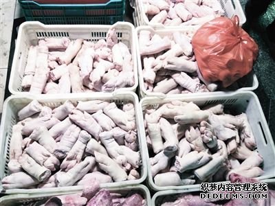朝阳奶西村加工作坊冰柜内码放的未加工猪蹄,其与左侧被“泡制”过的猪蹄相比,布满血色,颜色发黄“没卖相”。