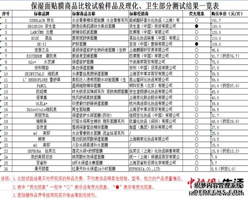保湿面贴膜商品比较试验样品及理化、卫生部分测试结果一览表