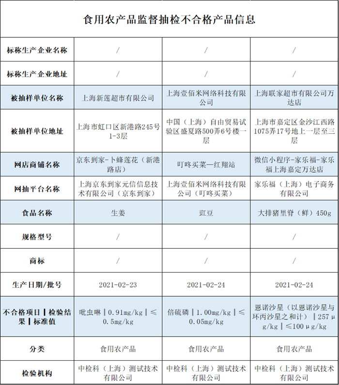 近日,上海市市场监督管理局公布2021年第18期省级食品安全抽检信息。结果显示,有3批次食品不合格,涉及生姜、豇豆以及大排猪里脊。