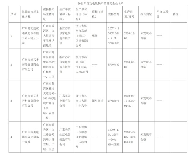 广州市市场监督管理局近日公布了今年第一季度自动电饭锅产品质量监督抽查结果,共抽查4批次产品,均符合标准要求。