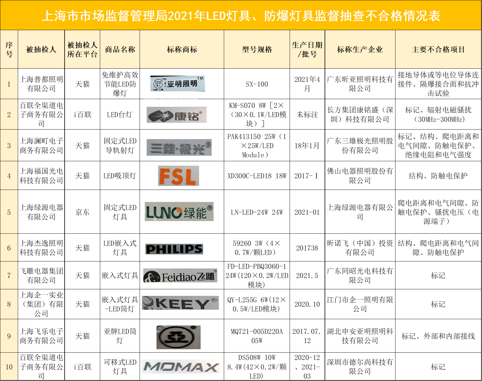 近日,上海市市场监督管理局对天猫、京东等5家网络交易平台销售的43批次LED灯具、防爆灯具进行了监督抽查。经检验,有10批次不合格(含1批次防爆灯具),不合…