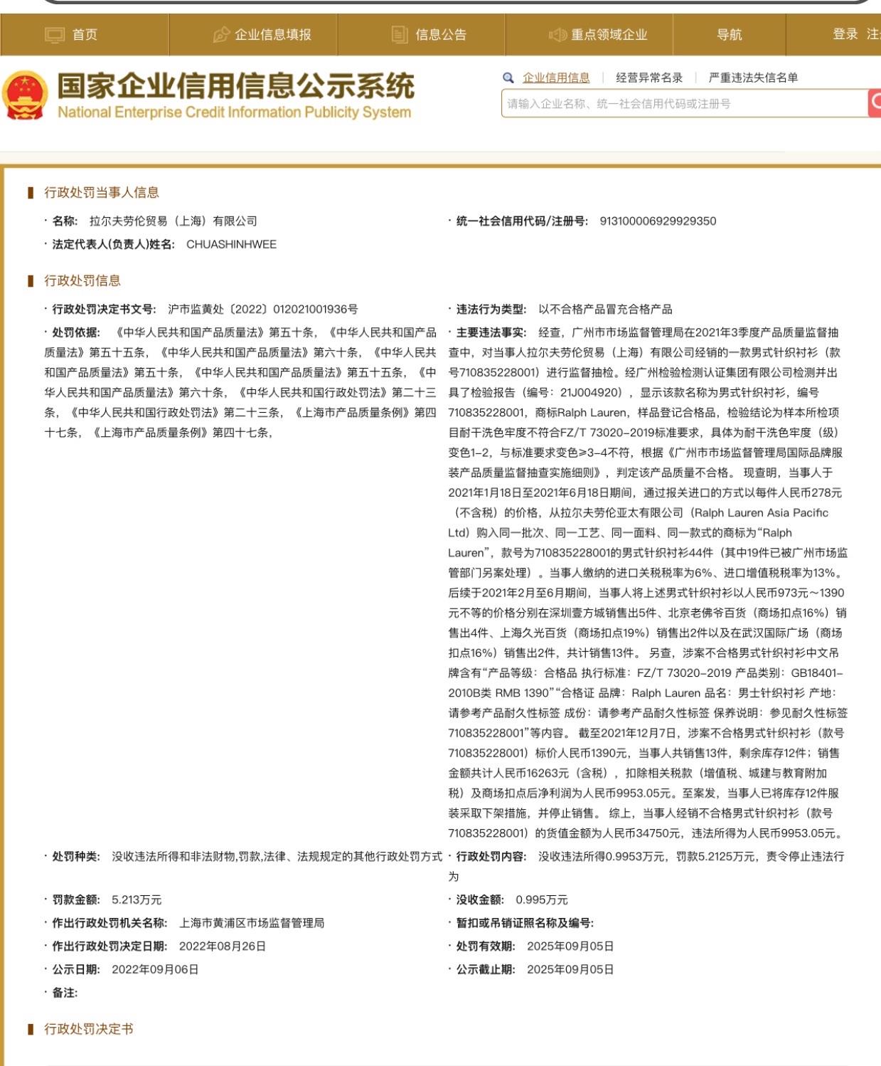 近日,《中国消费者报》记者从国家企业信用信息公示系统官网获悉,美国服装品牌Ralph Lauren(拉夫劳伦)关联公司拉尔夫劳伦贸易(上海)有限公司,因以不合格…