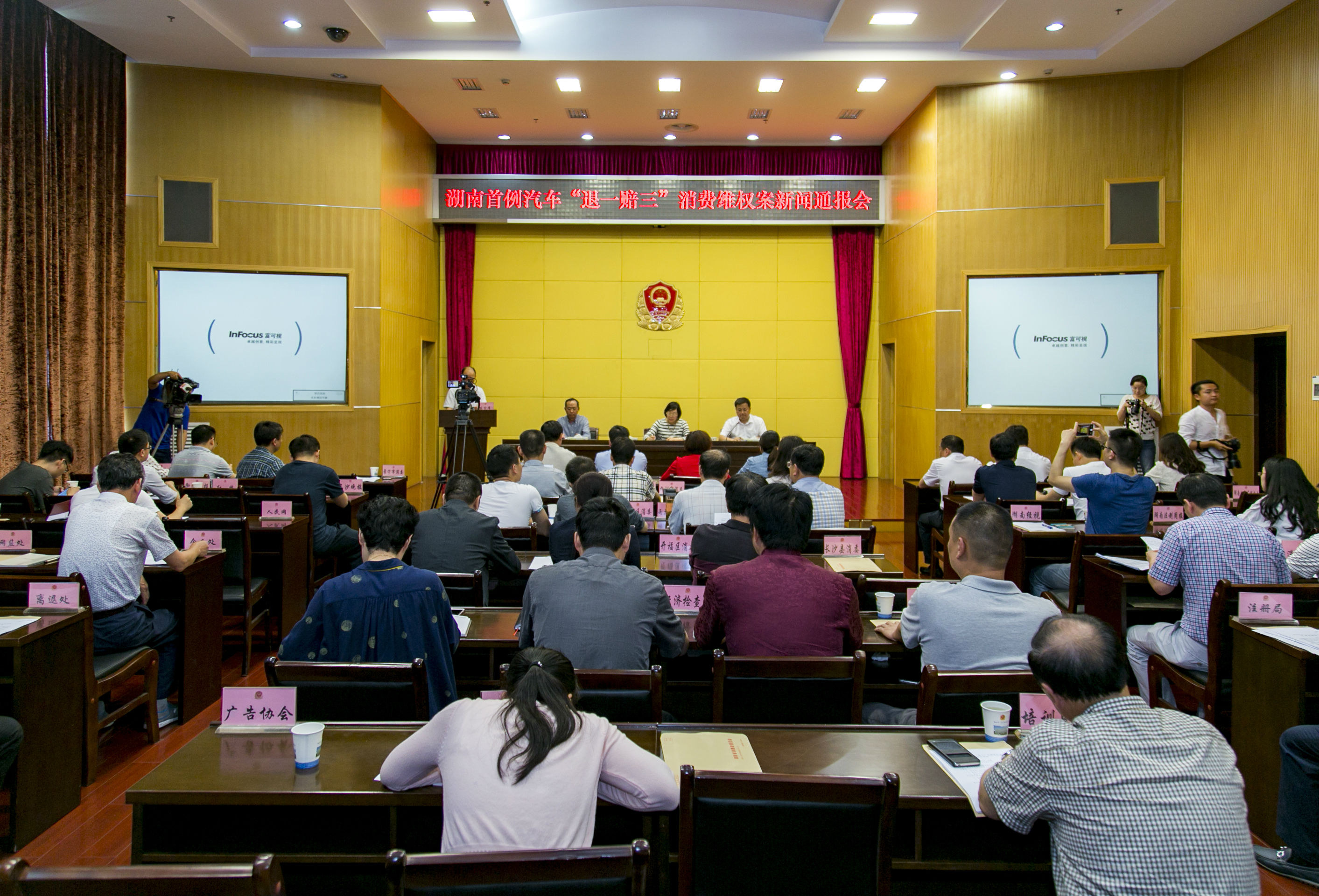 湖南省工商局举行的湖南首例汽车“退一赔三”消费维权案新闻通报会。余知都摄