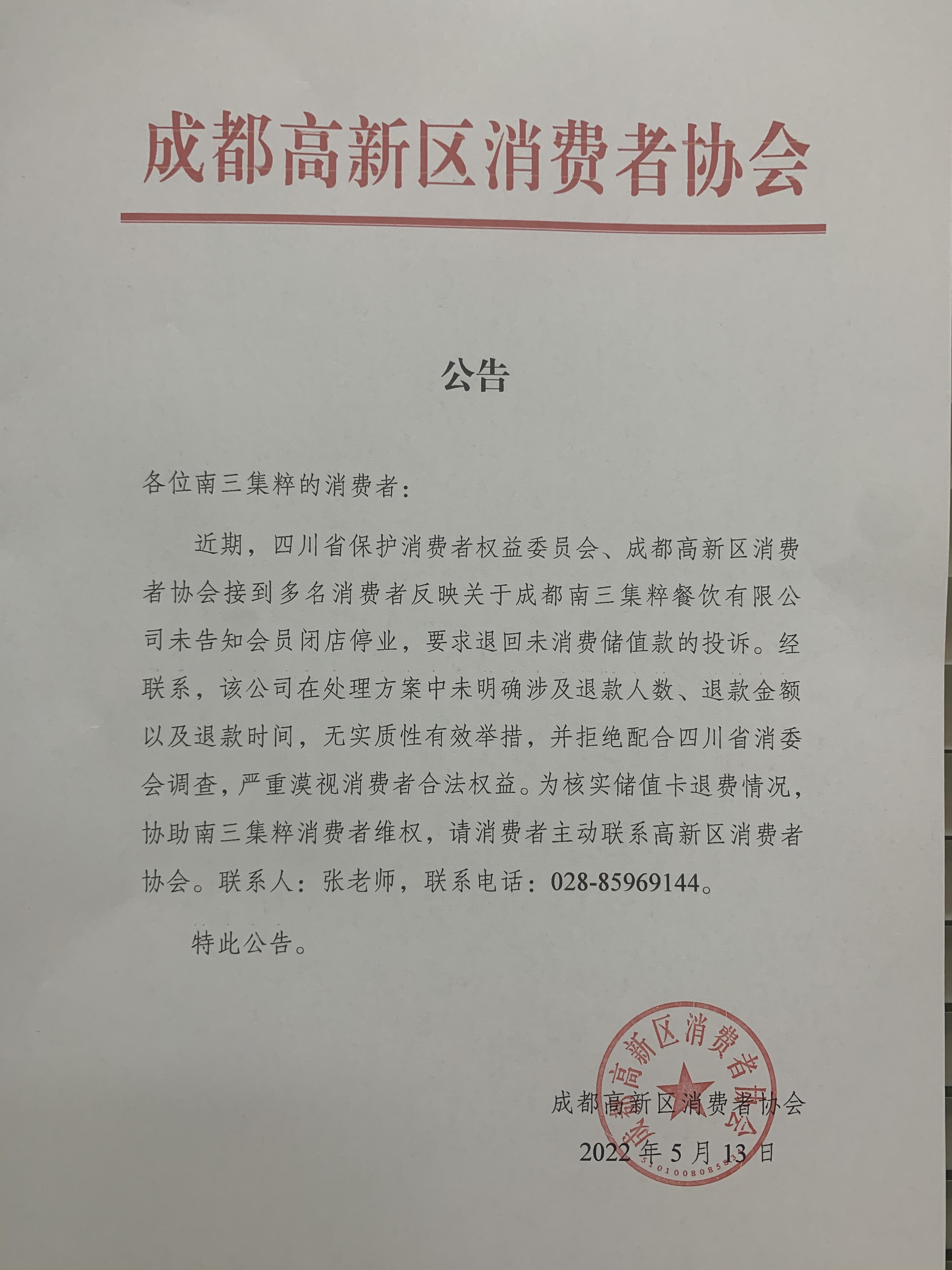 消费者于今年3月发现“南三集粹•中国菜馆”突然关闭,导致充值会员无法消费,储值款也无法退回,引发集体投诉(详见《中国消费者报》4月26日2版《“南三集粹…