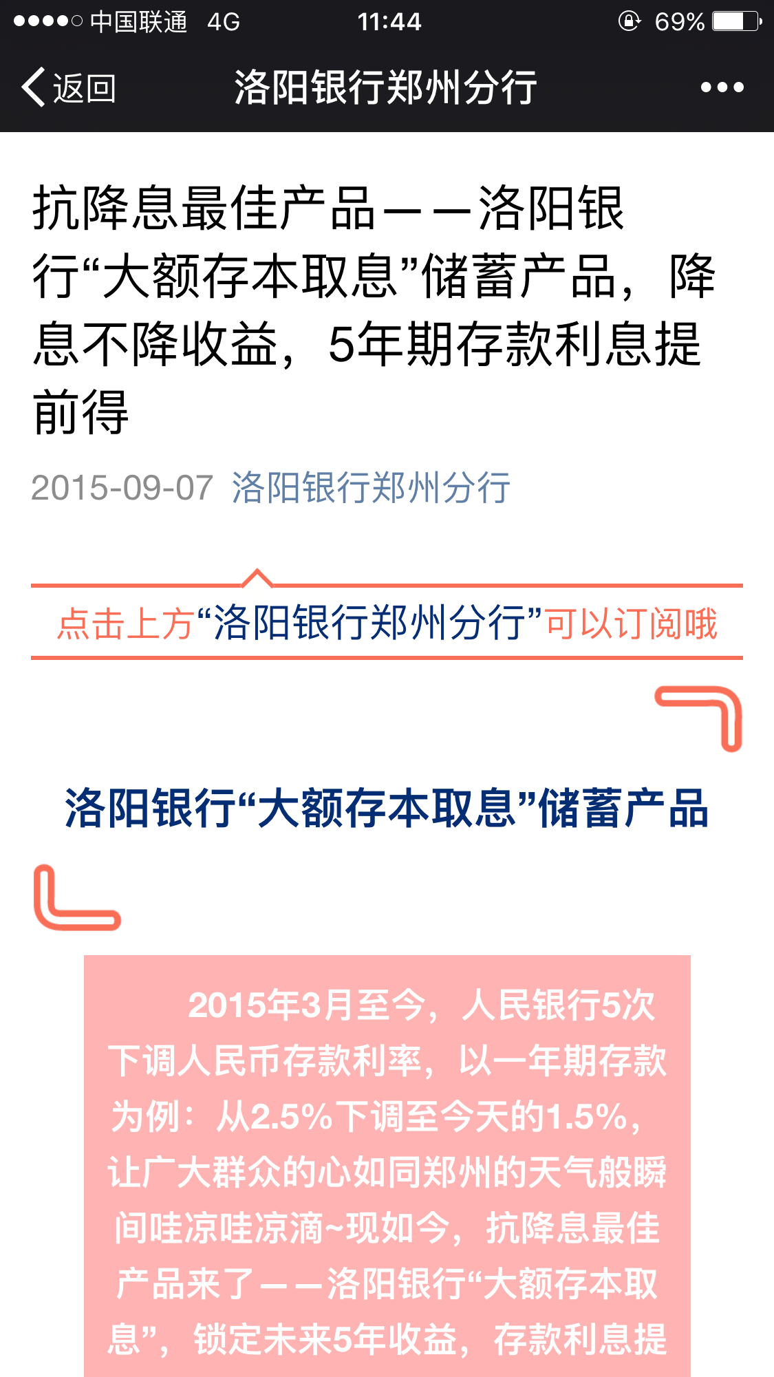 洛阳银行郑州分行在其微信公众号上发布的违法广告。微信截图